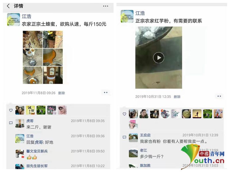 全縣23個(gè)鄉(xiāng)鎮(zhèn)的土豬、土雞、蜂蜜、葛根粉、干菜等土特產(chǎn)在他的朋友圈“輪番出售”。“農(nóng)家正宗土蜂蜜,預(yù)購(gòu)從速,每斤150元。”今年“雙11”之前,江浩在朋友圈“賣貨”,不一會(huì)兒便有買家留言,“來(lái)二斤,謝謝!”