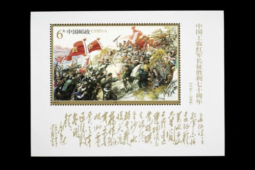 2006年10月22日,《中國(guó)工農(nóng)紅軍長(zhǎng)征勝利70周年》紀(jì)念郵票發(fā)行。郵票內(nèi)容分別為《送別》《遵義會(huì)議》《飛奪瀘定橋》《過草地》,小型張則以國(guó)畫《大會(huì)師》為主題圖案。