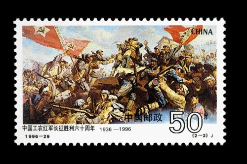 1996年10月22日,為了宣揚(yáng)中國(guó)工農(nóng)紅軍二萬五千里長(zhǎng)征精神,《中國(guó)工農(nóng)紅軍長(zhǎng)征勝利六十周年》紀(jì)念郵票發(fā)行。全套郵票共2枚,圖案分別采用了一組群雕《過草地》和一幅油畫《三軍大會(huì)師》。