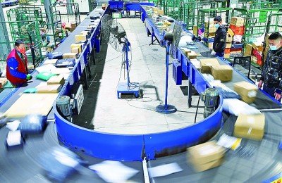 在中國郵政衡陽郵區中心局郵件處理中心,工作人員在分揀快遞包裹。 新華社發