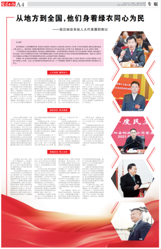 和殷勇一樣,來自宿遷郵政基層一線的吳愛軍、張良志、袁軍、洪瀟,分別當選江蘇省人大代表、宿遷市人大代表、泗陽縣人大代表、中揚鎮人大代表。五名人大代表傾聽來自基層的聲音,把一個個帶著露珠、冒著熱氣、散發泥土味的建議傳遞到不同層面的人代會上。