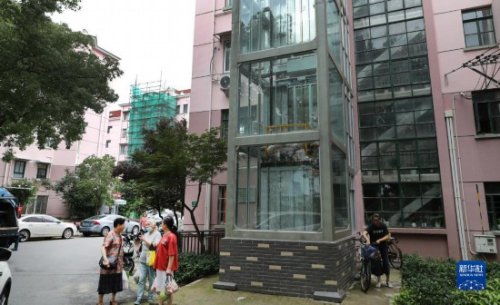 在上海市長寧區北新涇街道新涇六村,居民在加裝了電梯的12號樓旁聊天(2020年6月23日攝)。新華社記者 方喆 攝