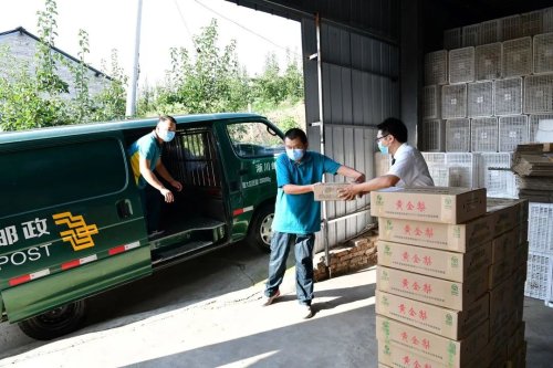 “大家都辛苦了,先歇歇,吃個(gè)果子再搬也不遲。”不遠(yuǎn)處,身著“郵政綠”的工作人員正揮汗如雨,幫果農(nóng)把金燦燦的富硒梨裝箱上車(chē)。