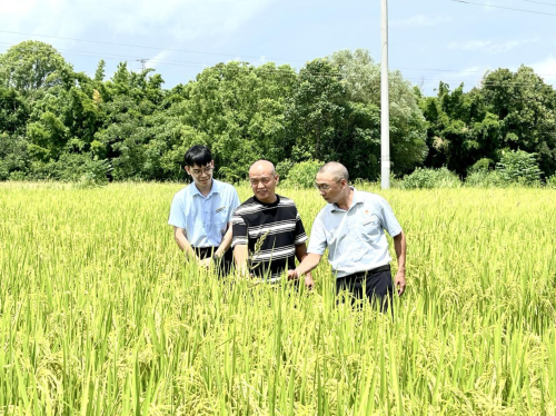 郵儲銀行贛州市分行客戶經理劉巍與客戶一同察看水稻種植情況