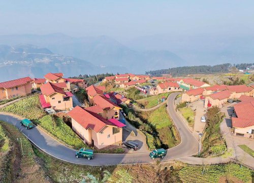 郵車駛入錯落有致的“彝家新寨”。□江宏景 攝