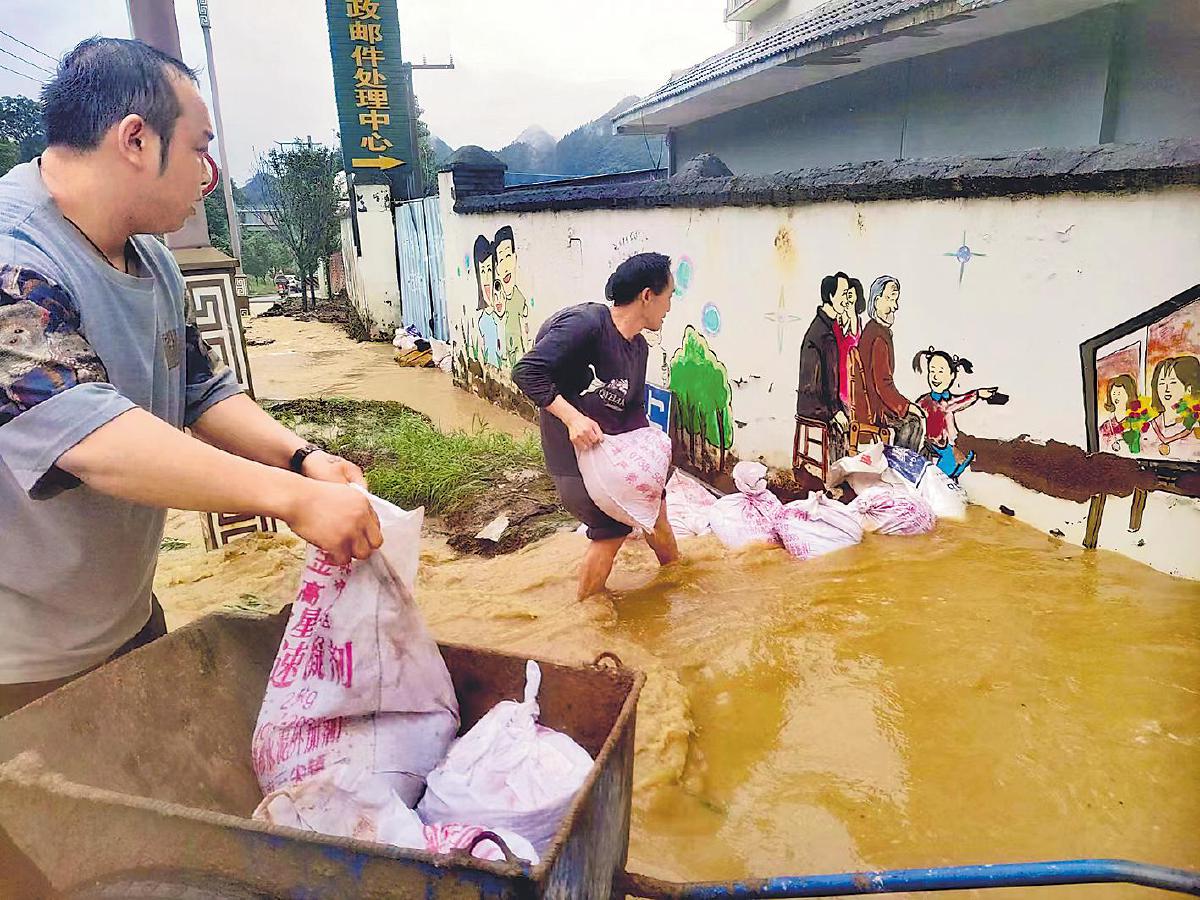 在貴州省黔東南苗族侗族自治州,山洪沖擊鎮(zhèn)遠縣郵件處理中心,郵政員工用沙袋堵洪引流,緩解水患?! 踔苌忻鳌z
